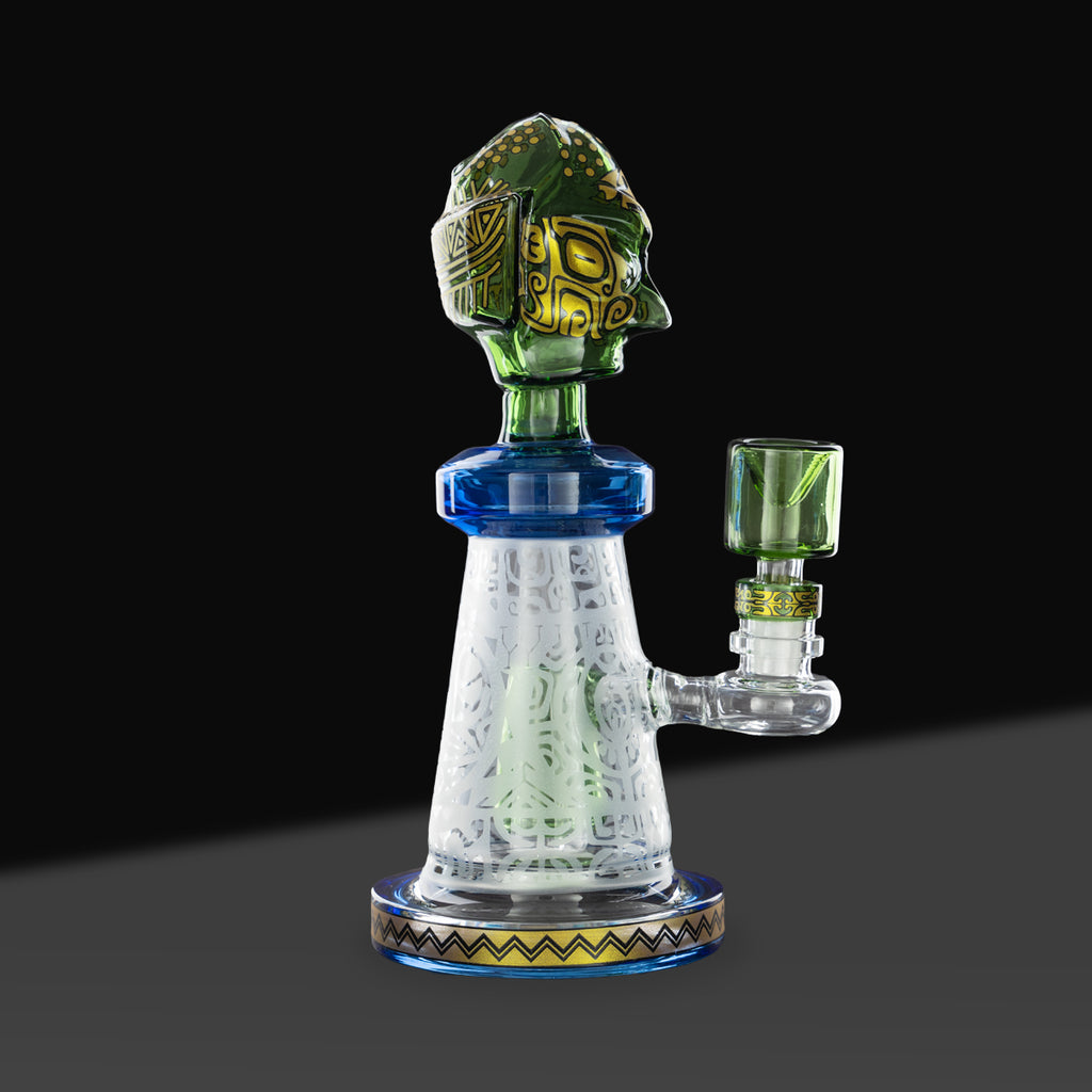 Crowning the piece is a bold, sculpted glass head adorned with gold decal accents, adding contrast and a premium visual touch. The decorative glass head pairs seamlessly with the etched beaker body, giving this etched beaker pipe a cohesive, art-forward look that performs just as well as it displays.